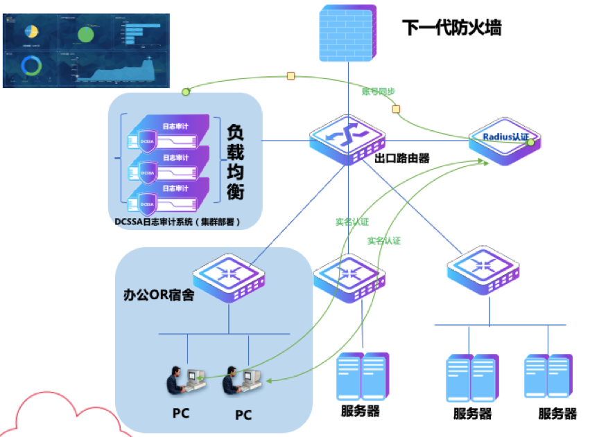 在完成日志信息采集的基础上,evo视讯真人官网DCSSA日志审计系统与网络中出口防火墙、行为审计等安全设备,以及负责身份识别的认证计费系统实现深度耦合,帮用户解决DHCP场景实名统计溯源、NAT转换实名、恶意行为追责、实名统计上网流量等众多问题。